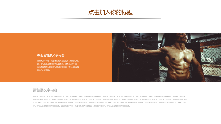 PPT简介: 健身运动PPT模板适用于健身运动海报宣传主题演示模板。本作品提供pptx格式文件下载,站长素材PPT大全提供精选的PPT模板素材。