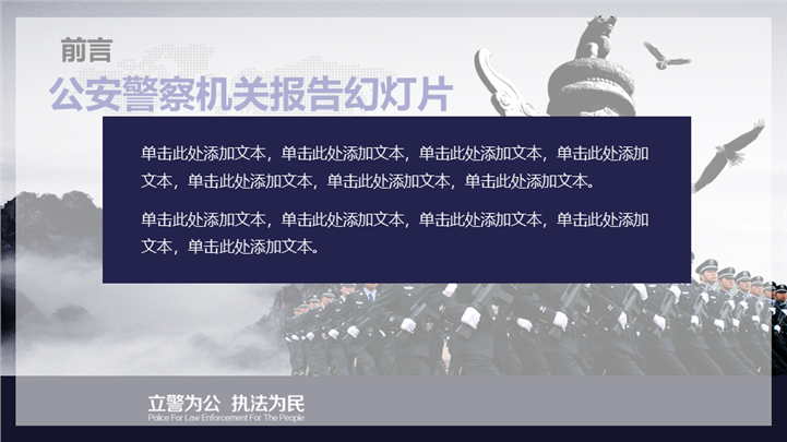 PPT简介: 公安警察PPT模板适用于国家机关单位工作计划总结报告演示模板。本作品提供pptx格式文件下载,站长素材PPT大全提供精选的PPT模板素材。