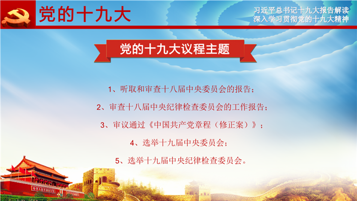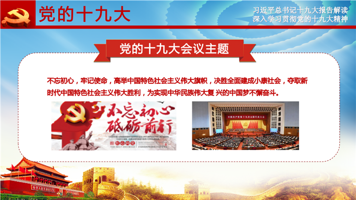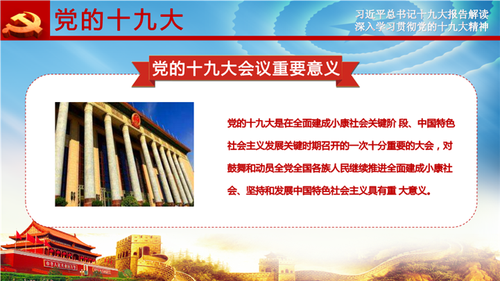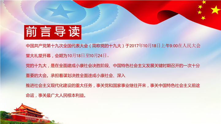 PPT简介: 十九大报告PPT模板适用于党政党务工作报告解读演示模板。本作品提供pptx格式文件下载,站长素材PPT大全提供精选的PPT模板素材。