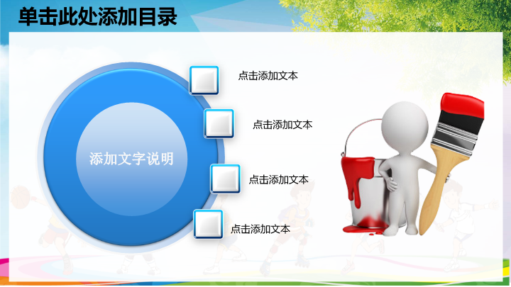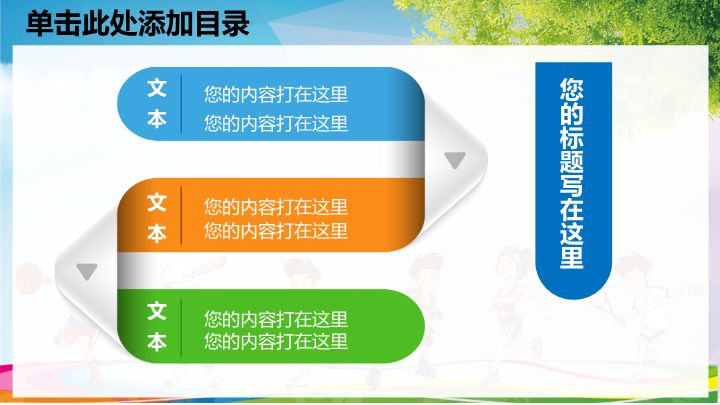 PPT简介: 体育活动PPT模板适用于中小学儿童体育锻炼活动宣传演示模板。本作品提供pptx格式文件下载,站长素材PPT大全提供精选的PPT模板素材。