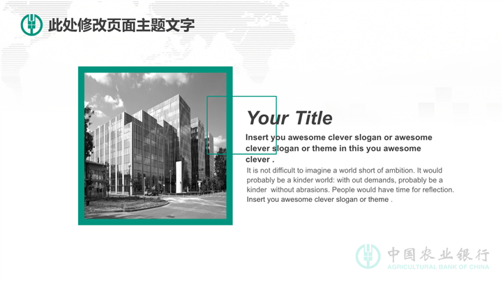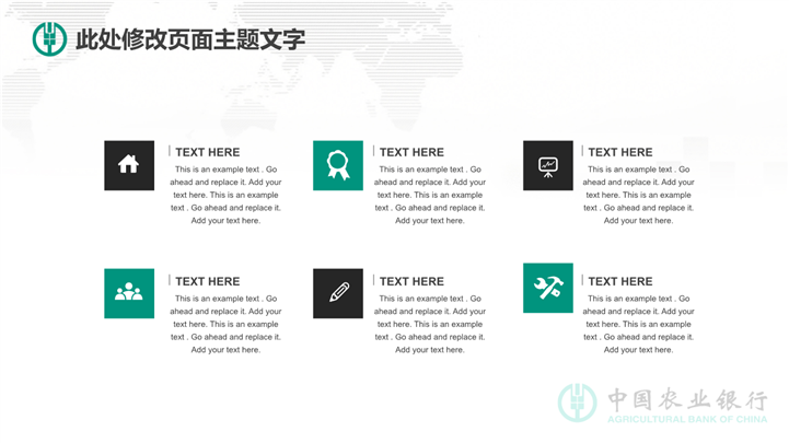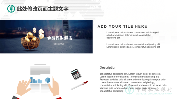 PPT简介: 农行系统中国农业银行总结汇报PPT模板适用于农业银行演示模板。本作品提供pptx格式文件下载,站长素材PPT大全提供精选的PPT模板素材。