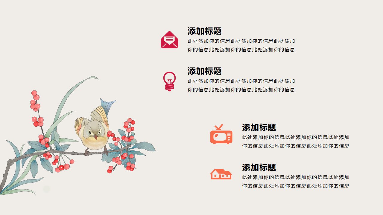 PPT简介: 小清新花鸟红色工作计划PPT模板适用于简约古风工作总结演示模板。本作品提供ppt或pptx格式文件下载,站长素材PPT大全提供精选的PPT模板素材。