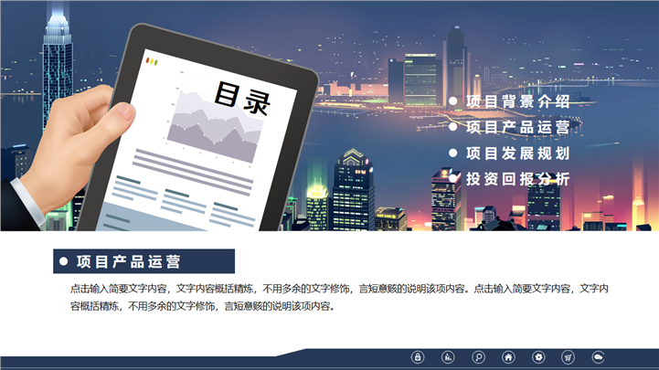 PPT简介: 企业项目发展商业策划书通用PPT模板适用于商业策划书演示模板。本作品提供pptx格式文件下载,站长素材PPT大全提供精选的PPT模板素材。