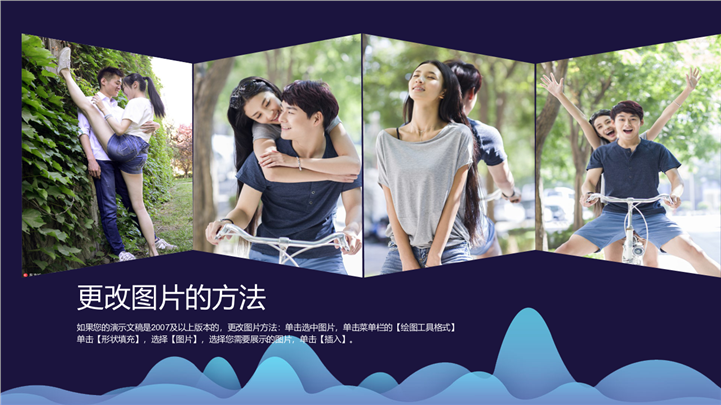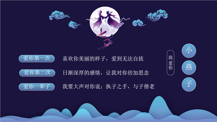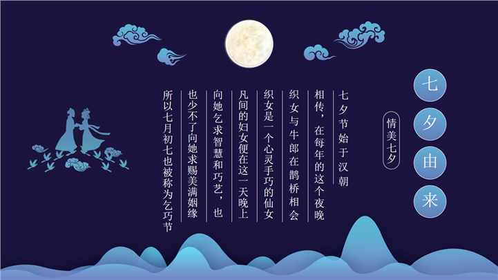 PPT简介: 七夕情人节婚礼主题相册PPT模板是一款七夕婚礼主题PPT模板,以蓝色为基础色调,包含牛郎织女、鹊桥相会、情侣照片等元素,阐述相遇、相知、相爱的故事,脉络清晰,极具浪漫温馨气息,适用于七夕情人节婚礼主题演示模板。本作品提供pptx格式文件下载,站长素材PPT大全提供精选的PPT模板素材。