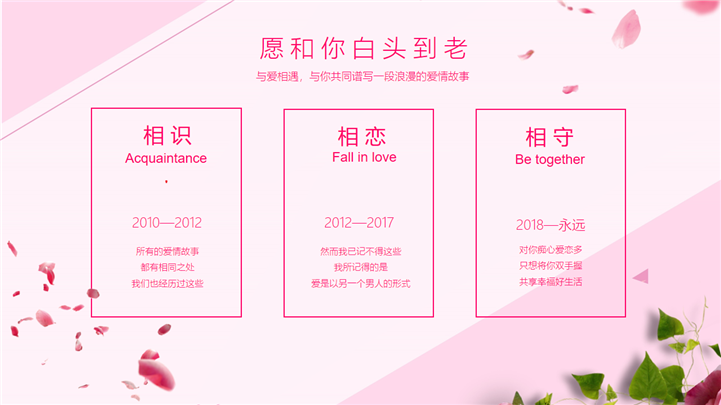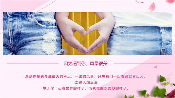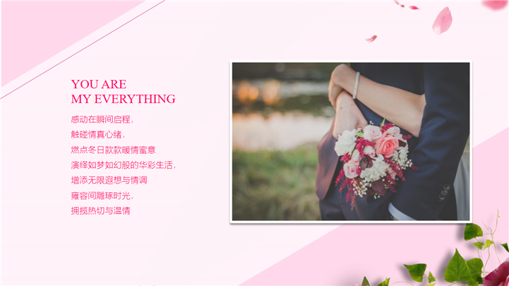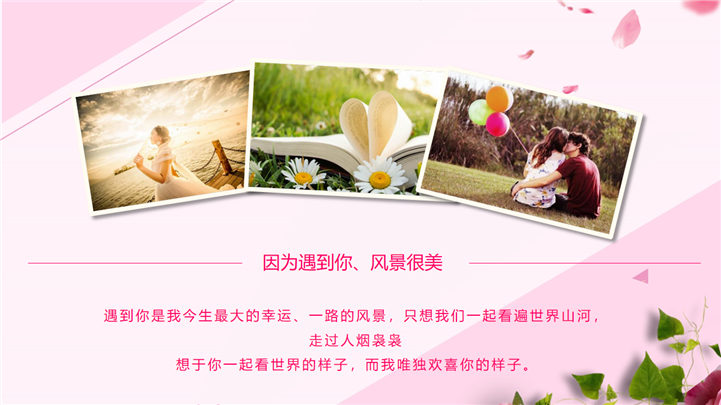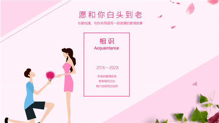 PPT简介: 我们结婚吧七夕婚礼主题相册PPT模板是一款七夕婚礼主题PPT模板,整个模板以少女粉色调为基础色调,封面卡通情侣插画、玫瑰、花瓣等元素,讲述了新婚恋人从相识、相恋、相守的故事,通用于情侣表白、求婚、结婚等场景演示模板。本作品提供pptx格式文件下载,站长素材PPT大全提供精选的PPT模板素材。