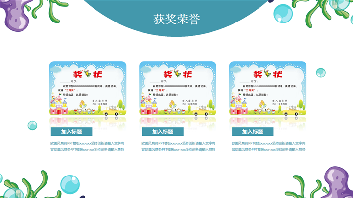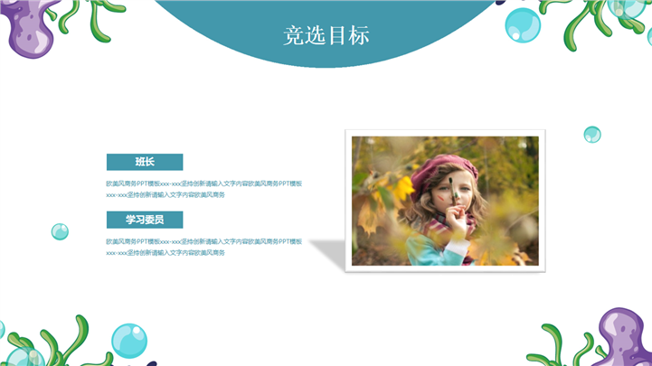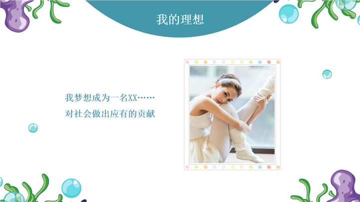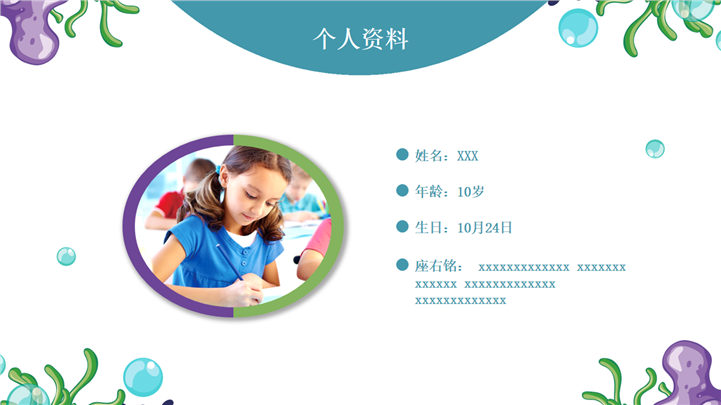 PPT简介: 卡通海洋风班委大队委竞选自我介绍PPT模板是一款自我介绍PPT模板,以蓝色海洋海洋、气泡、珊瑚等卡通元素为封面,涵盖个人资料、获奖荣誉、我的性格、我的兴趣、社会实践、竞选宣言等模块内容,通用于班委、大队长、大队委等不同班委竞选自我介绍演示模板。本作品提供pptx格式文件下载,站长素材PPT大全提供精选的PPT模板素材。