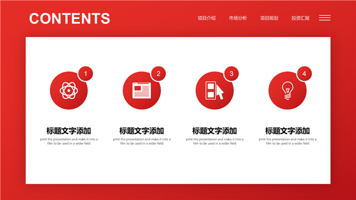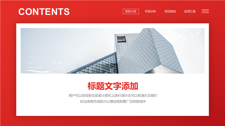 PPT简介: 红色商务风城市建设项目规划PPT模板红色商务风格PPT模板,包含项目介绍、市场分析、项目规划和投资汇报等方面内容,框架完整,内容详实,可自由编辑,适用于城市建设、项目规划等方面演示模板。本作品提供pptx格式文件下载,站长素材PPT大全提供精选的PPT模板素材。