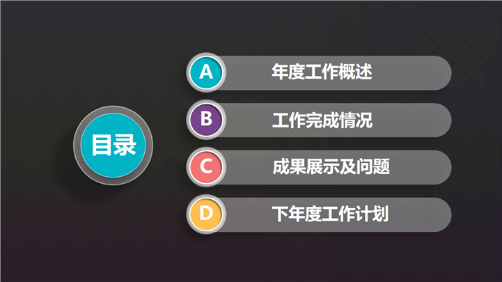 PPT简介: 黑色风格年度季度工作总结PPT模板是一款工作总结PPT模板,整个模板以黑色为基础色调,结合各种不同数据图形和图表,涵盖年度工作概述、工作完成情况、成果展示极问题、下半年工作计划等内容,框架完整,内容详实,适用于季度、年中、年度工作总结演示模板。本作品提供pptx格式文件下载,站长素材PPT大全提供精选的PPT模板素材。