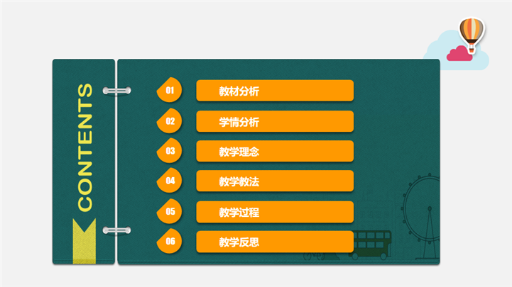 PPT简介: 微立体卡通风教师说课动态PPT模板是一款教师课件PPT模板,封面包含了热气球、黑板、飞机、喇叭、灯泡等微粒体卡通元素,内容涵盖教材分析、学情分析、教学理念、教学教法、教学过程、教学反思等方面,通用于各学科教师说课演示模板。本作品提供pptx格式文件下载,站长素材PPT大全提供精选的PPT模板素材。