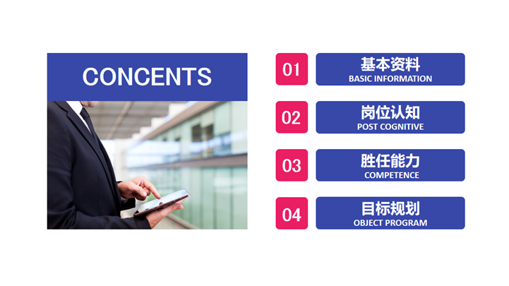 PPT简介: 公司企业岗位竞聘报告述职演讲PPT模板是岗位竞聘PPT模板,模板涵盖基本资料、岗位认知、胜任能力和目标规划等内容,框架完整,内容详实,适用于各行业各岗位竞聘述职报告演示模板。本作品提供pptx格式文件下载,站长素材PPT大全提供精选的PPT模板素材。