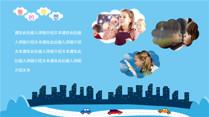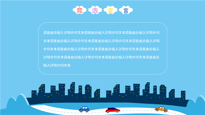PPT简介: 蓝色卡通小学班干部竞选自我介绍PPT模板是一款小学班干部竞选自我介绍PPT模板,整套模板包含了飞机、热气球、蓝天、白云、城市建筑、汽车等卡通元素,内容涵盖自我推荐、我的优点、兴趣、理想、荣誉、生活以及竞选岗位和宣言等方面,通用于各小学年级各竞选岗位自我介绍演示模板。本作品提供pptx格式文件下载,站长素材PPT大全提供精选的PPT模板素材。