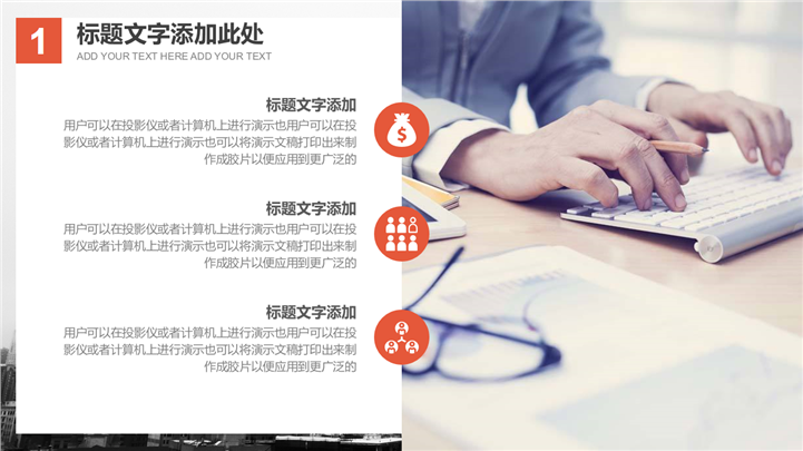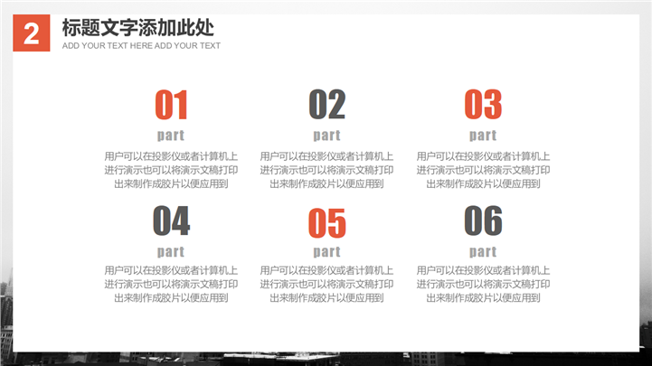 PPT简介: 欧美高端商务风办公通用PPT模板以黑白城市高楼建筑为封面背景,并贯穿整套模板,内容根据目录罗列6个方面,可自由编辑修改,不同的数据图形和图表以及商务插图相互融合,既高端又大气,适用于各行业岗位商务办公演示模板。本作品提供pptx格式文件下载,站长素材PPT大全提供精选的PPT模板素材。