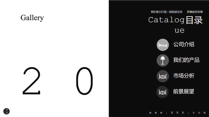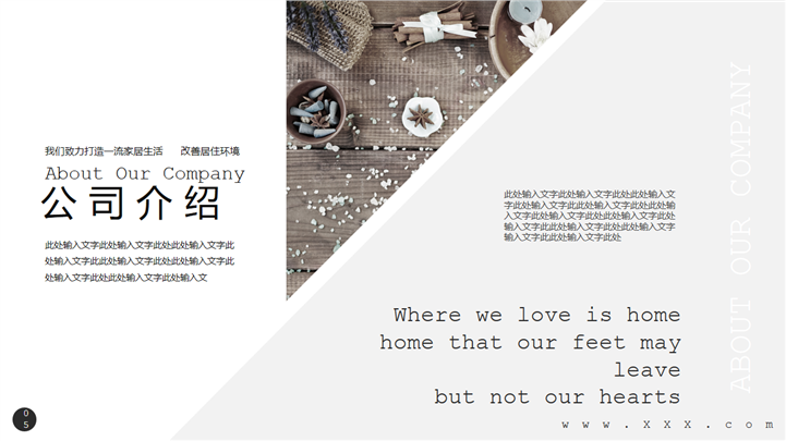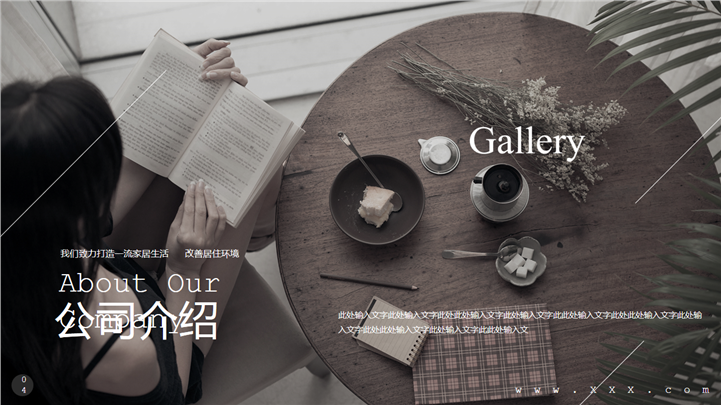 PPT简介: 北欧风格简洁时尚家居用品公司产品介绍PPT模板是一款家居公司产品介绍PPT模板,内容函告公司介绍、我们的产品、市场分析和前景展望等四个模块,色调沉稳简洁,内容详实得当,可自由编辑修改,适用于家居行业各产品演示模板。本作品提供pptx格式文件下载,站长素材PPT大全提供精选的PPT模板素材。
