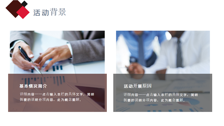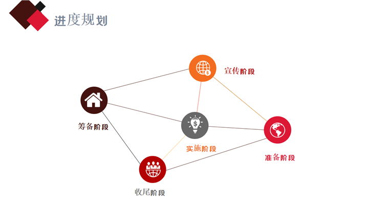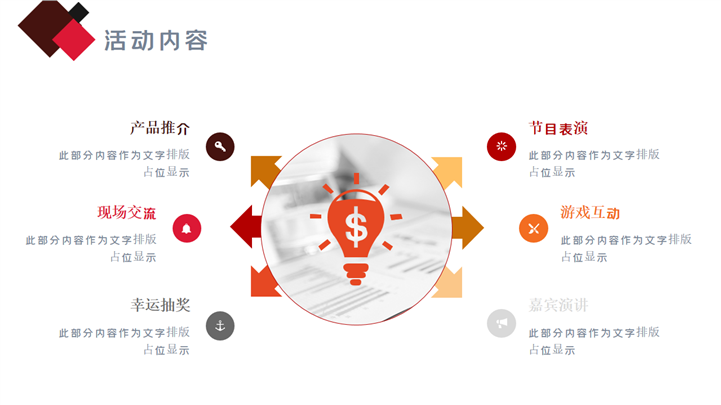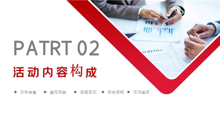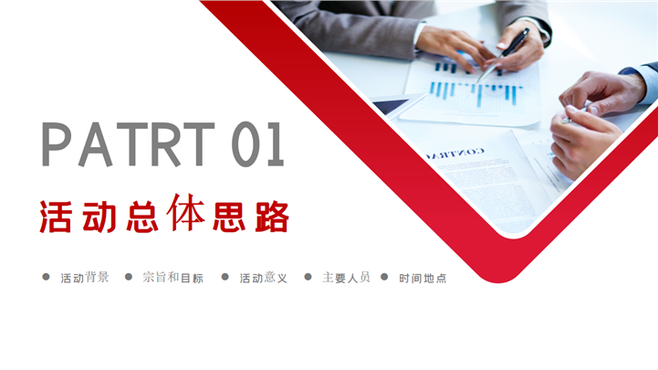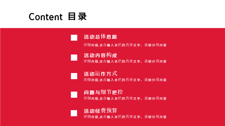 PPT简介: 欧美红色高端商务风活动策划PPT模板是一款活动策划PPT模板,以红色为基础色调,涵盖活动总体思路、活动内容构成、活动运作方式、问题与细节把控、活动经费预算等模块内容,框架完整,内容详实得当,可自由编辑修改,适用于各种不同活动策划方案演示模板。本作品提供pptx格式文件下载,站长素材PPT大全提供精选的PPT模板素材。