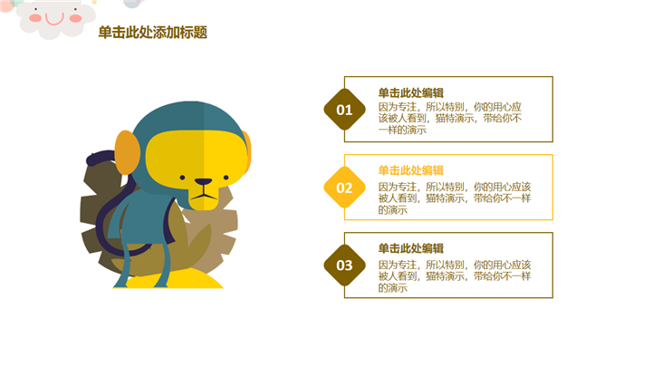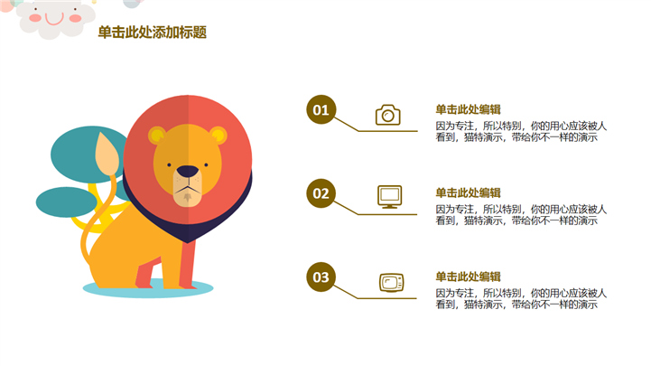 PPT简介: 可爱卡通幼儿教育教学课件通用PPT模板包含了大象、长颈鹿、狮子、猴子、小火车、猫头鹰、乌龟等卡通元素,并结合各种不同的数据图表进行阐述,风格可爱清新,适用于幼儿教育教学课件演示模板。本作品提供pptx格式文件下载,站长素材PPT大全提供精选的PPT模板素材。