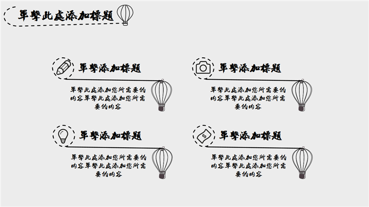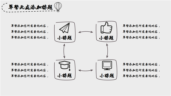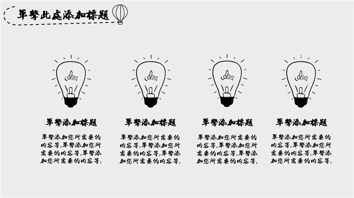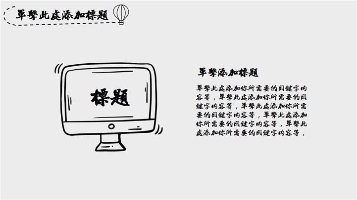 PPT简介: 灰白卡通手绘风格通用PPT模板是一款手绘风格PPT模板,整套模板为灰白色调,以卡通草地风车、植物、建筑等为封面元素,内容包含纸飞机、指示牌、汽车、电脑、灯泡等手绘元素,风格简约文艺,适用于卡通手绘风格场景演示模板。本作品提供pptx格式文件下载,站长素材PPT大全提供精选的PPT模板素材。