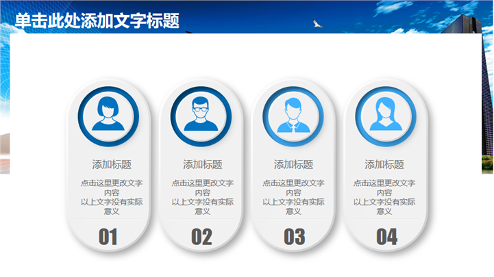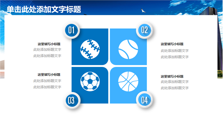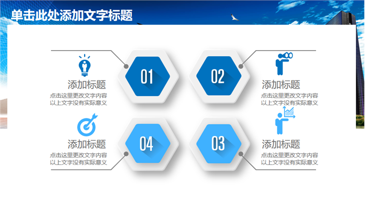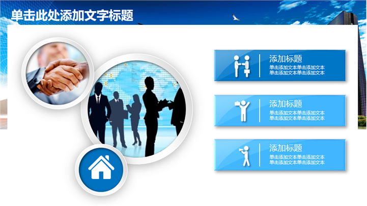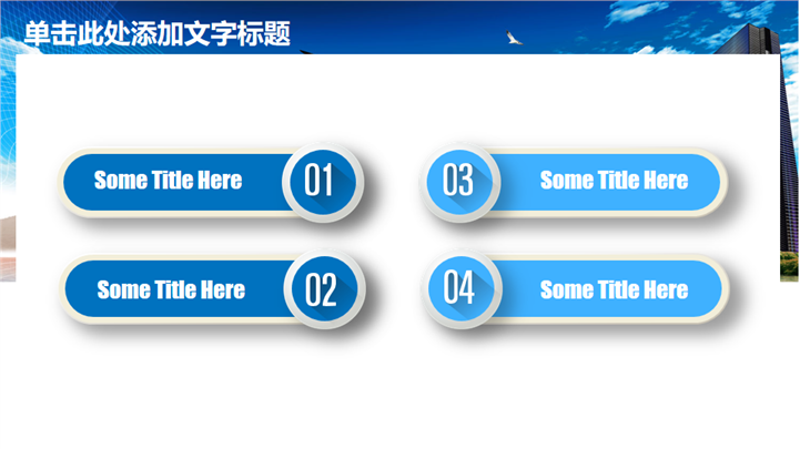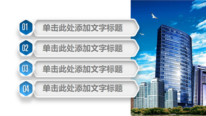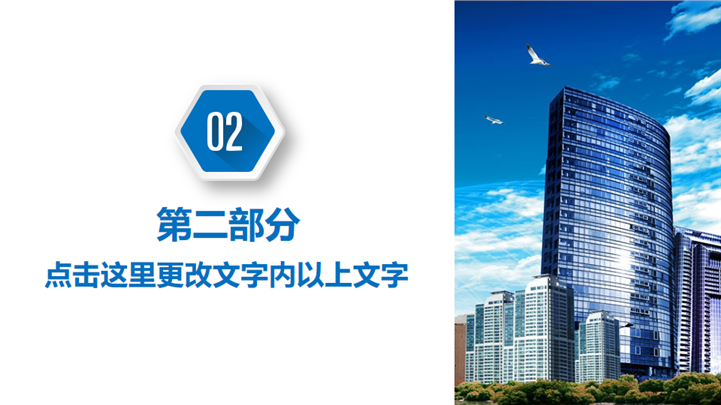PPT简介: 清爽蓝色风格房产建设城市规划PPT模板以天空蓝为基础色调,并贯穿整套模板,以新型现代高楼建筑为封面,结合标题文字点明主题。内容涵盖不同商务建筑和商务场景,并通过不同类型的数据图形和统计图表进行分析阐述,框架完整,内容详实可自由编辑,适用于房地产建设、城市规划等方面演示模板。本作品提供pptx格式文件下载,站长素材PPT大全提供精选的PPT模板素材。