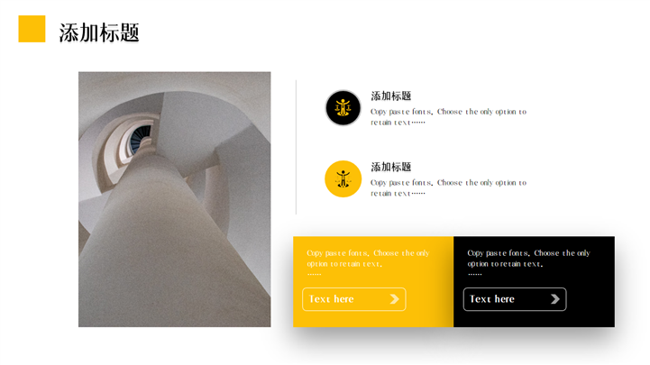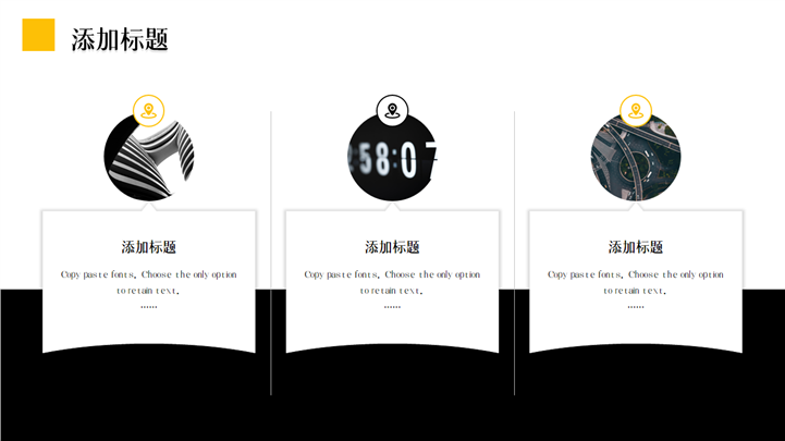 PPT简介: 欧美极简主义企业宣传公司介绍PPT模板是一款企业宣传PPT模板,内容元素以黄色和黑色两种色调相互搭配,涵盖公司介绍、项目介绍、运营状况、发展计划等模块内容,框架完整,配色醒目,风格简约,通用于各行业企业宣传、公司介绍等方面演示模板。本作品提供pptx格式文件下载,站长素材PPT大全提供精选的PPT模板素材。