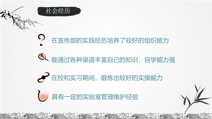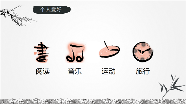 PPT简介: 中国水墨风格个人简历PPT模板是一款个人简历PPT模板,以山峰、湖泊、船舶、飞鸟、古松等水墨风元素为封面,内容涵盖个人信息、教育经历、专业技能、个人爱好、社会经历和联系信息等方面,共7张幻灯片,通用于各行业各岗位以中国风为主题的个人简历演示模板。本作品提供pptx格式文件下载,站长素材PPT大全提供精选的PPT模板素材。