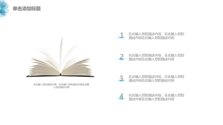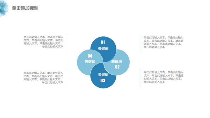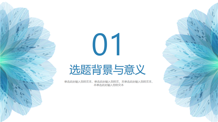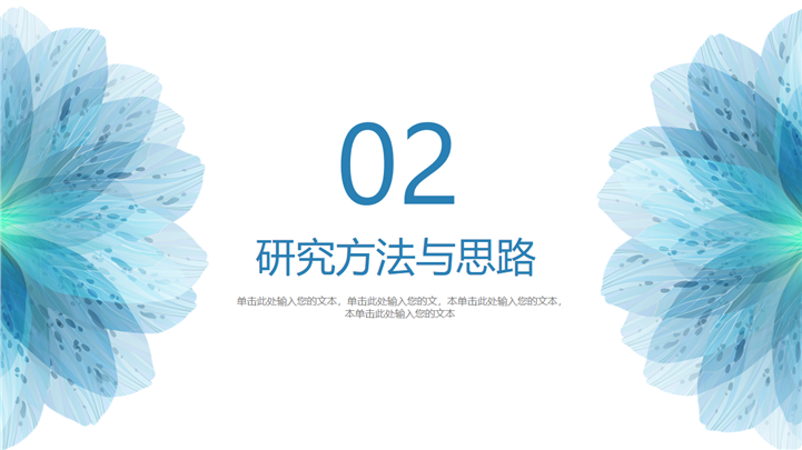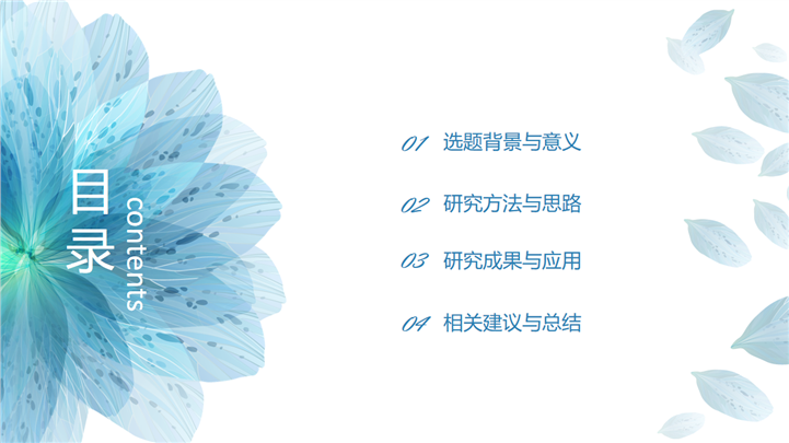 PPT简介: 蓝色清新高校毕业论文答辩通用PPT模板是一款毕业论文答辩PPT模板,以清新淡雅蓝色为主要色调,并贯穿整套模板,以花卉为封面元素,主要章节的引导页和封面元素保持一致,内容涵盖选题背景与意义、眼镜方法与思路、研究成功与应用、相关建议与总结等方面,内容文本可自由编辑,框架完整,风格清新,通用于各专业毕业论文答辩演示模板。本作品提供pptx格式文件下载,站长素材PPT大全提供精选的PPT模板素材。
