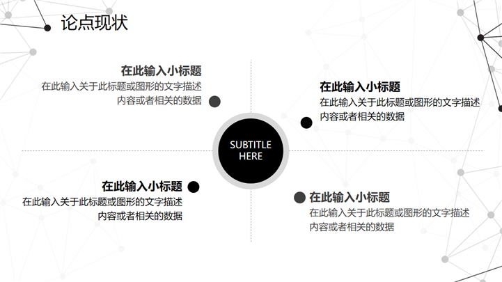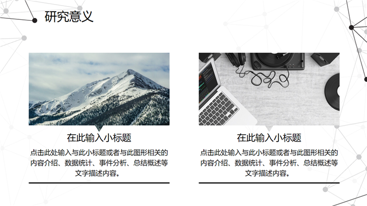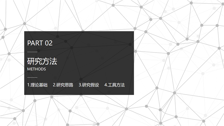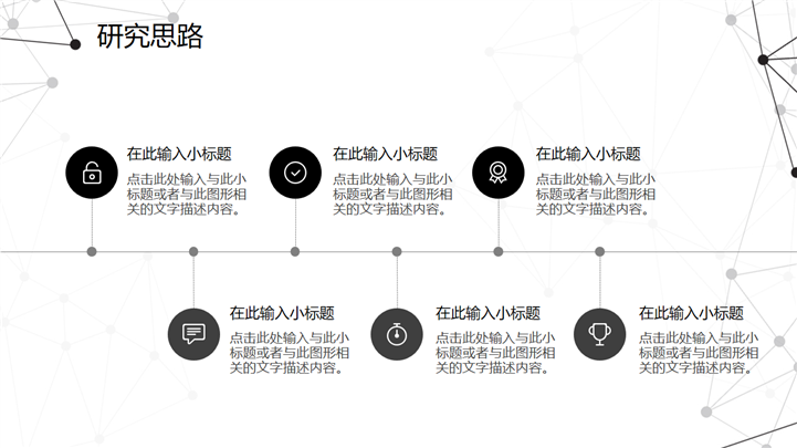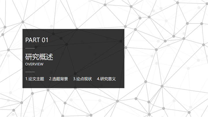 PPT简介: 黑白质感点线风格毕业设计答辩PPT模板是一款毕业答辩PPT模板,以黑白为基础色调,以点线为封面元素,并将其色调和元素贯穿到整套模板中,内容涵盖研究概述、研究方法、研究过程、问题讨论和概括总结等模块,整套模板极具质感,通用于各院校专业毕业答辩演示模板。本作品提供pptx格式文件下载,站长素材PPT大全提供精选的PPT模板素材。