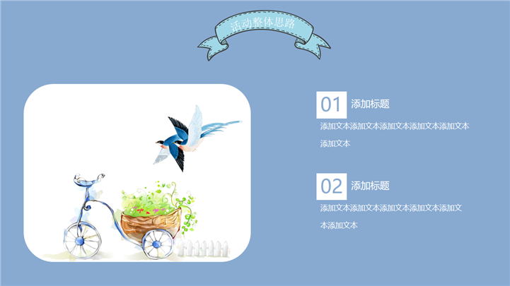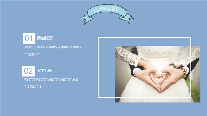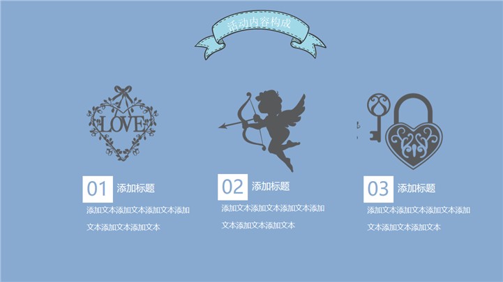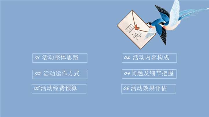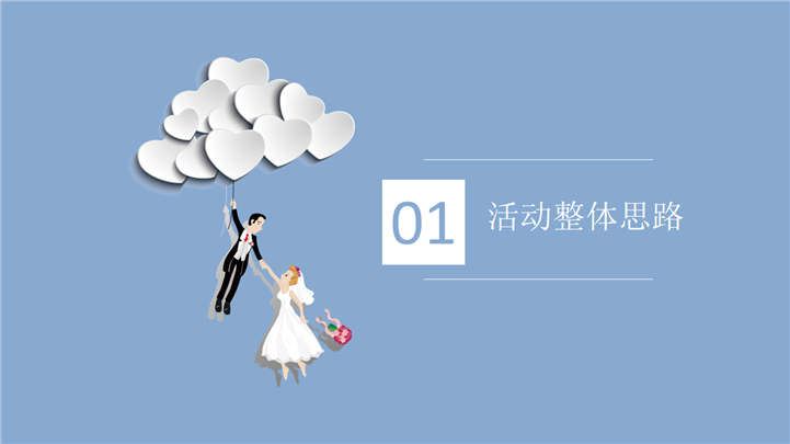 PPT简介: 蓝色极简风情人节活动策划PPT模板是一款情人节活动策划PPT模板,以淡雅蓝色为基础色调并贯穿整套模板,包含情侣、信鸽、气球、爱心、丘比特之箭、天使等卡通元素,内容涵盖活动整体思路、活动内容构成、活动运作方式、问题及细节把握、活动经费预算和活动想评估等方面,框架完整,内容详实,通用于各种场景的情人节活动策划演示模板。本作品提供pptx格式文件下载,站长素材PPT大全提供精选的PPT模板素材。