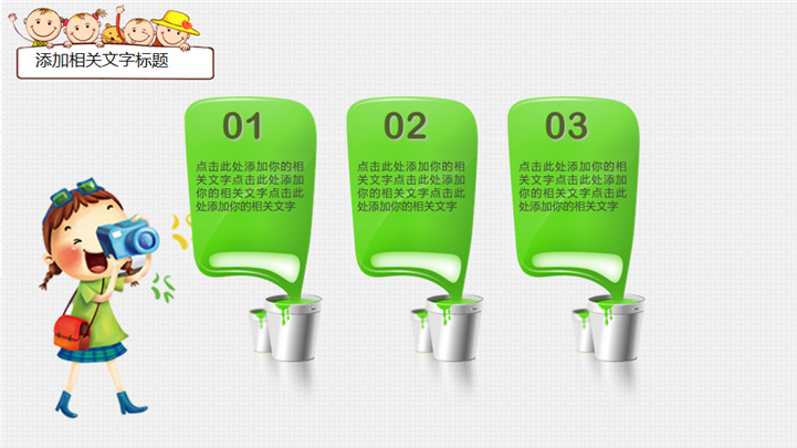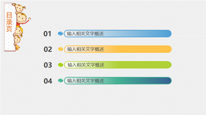 PPT简介: 卡通风格幼儿园儿童主题教育课件PPT模板是一款教育课件PPT模板,以格纹背景为模板底纹背景,并贯穿整套模板,以各种不同风格的卡通元素为插图元素,贯穿每张幻灯片,内容以目录为依据,结合各种数据图表进行阐述,框架完整,内容丰富,风格简约可爱,适用于儿童主题、卡通风格、幼儿园、教育课件等方面演示模板。本作品提供pptx格式文件下载,站长素材PPT大全提供精选的PPT模板素材。