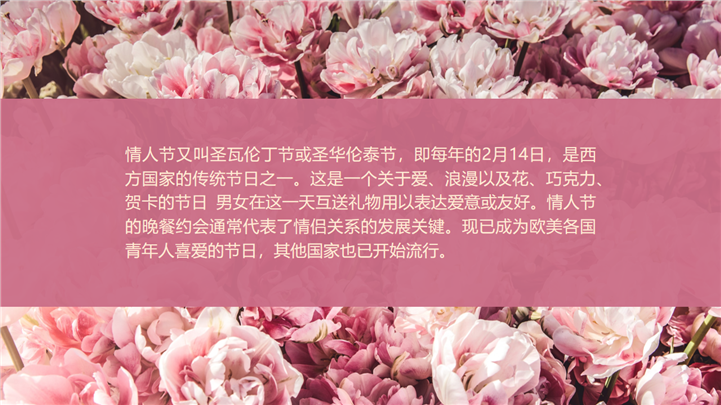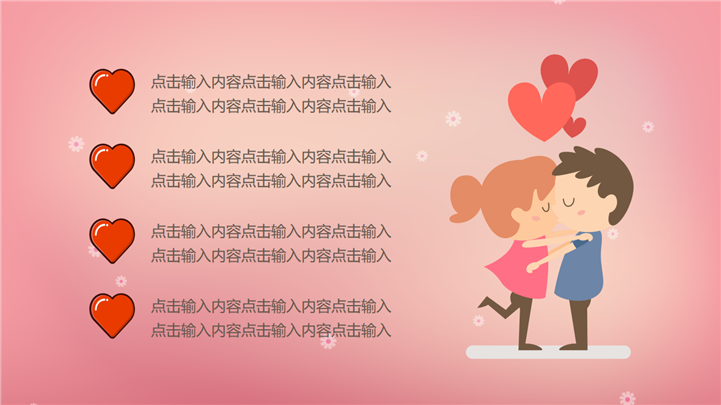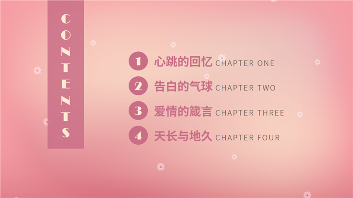 PPT简介: 粉色情人节告白活动恋爱回顾ppt模板是一款情人节主题PPT模板,以粉色爱心背景为模板底纹背景,包含爱心、气球、情侣、单车等浪漫风格的卡通元素,并贯穿整套模板,内容涵盖心跳的回忆、告白的气球、爱情的箴言、天长与地久等模块,框架完整,内容充实,风格简约不失浪漫,通用于以情人节为主题的告白活动和恋爱回顾等方面演示模板。本作品提供pptx格式文件下载,站长素材PPT大全提供精选的PPT模板素材。