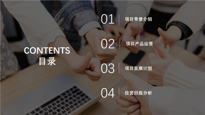 PPT简介: 企业宣传产品运营项目发展计划通用PPT模板是一款企业宣传PPT模板,内容涵盖项目背景介绍、项目产品运营、项目发展计划、投资汇报分析等模块,目录与封面背景保持一致,各主章节背景也保持一致,整体框架完整,风格简约,配色商务大气,通用于各行业企业宣传、产品运营、项目发展计划等方面演示模板。本作品提供pptx格式文件下载,站长素材PPT大全提供精选的PPT模板素材。