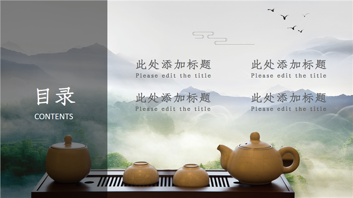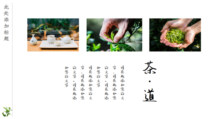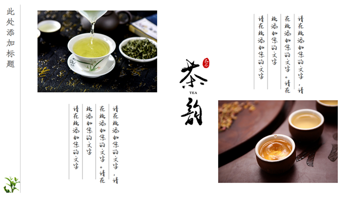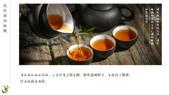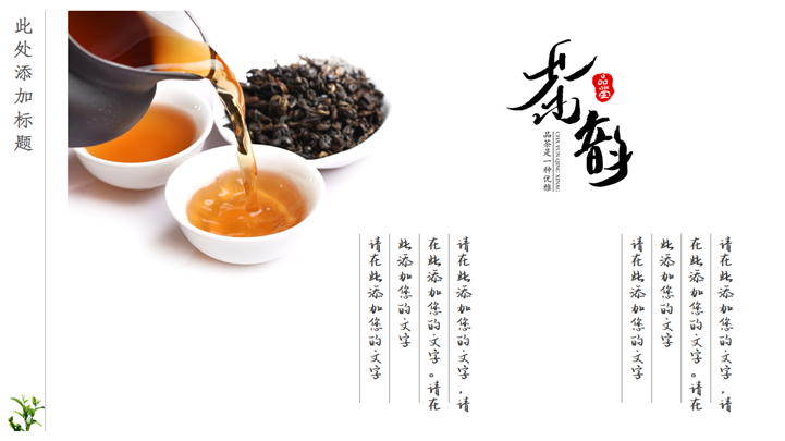 PPT简介: 人生如茶茶道文化茶文化主题PPT模板以不同场景和角度的茶杯、茶壶、茶水、茶叶等摄影图片为背景和插图,以人生如茶为主题,内容以目录为依据,通过不同形式的图文排版方式,进行内容阐述,适用于关于茶道、茶文化相关主题演示模板。本作品提供pptx格式文件下载,站长素材PPT大全提供精选的PPT模板素材。