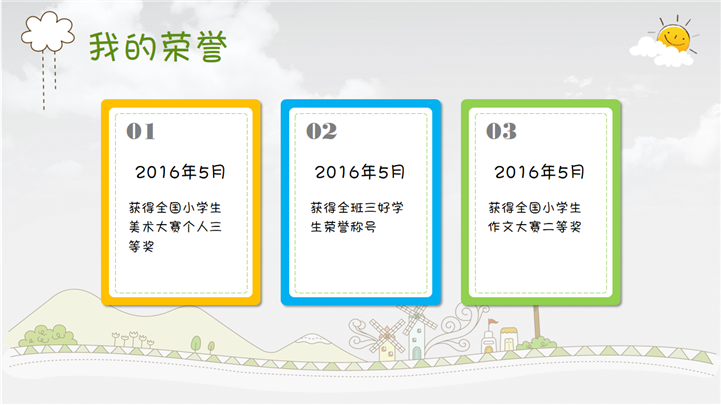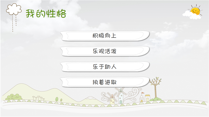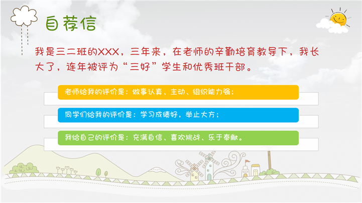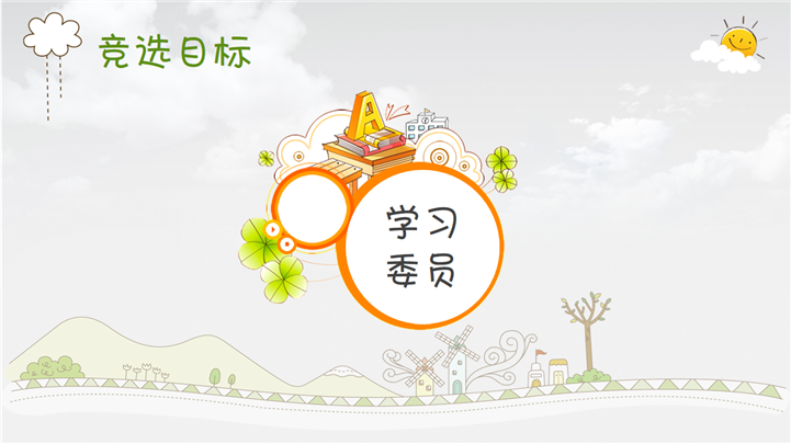 PPT简介: 清新卡通小学生班干部竞选自我介绍PPT模板是竞选自我介绍PPT模板,以卡通插画为模板背景,并贯穿整套模板,内容涵盖个人基础信息、自荐信、我的爱好、我的性格、我的生活、我的理想、我的荣誉、获奖证书、竞选宣言等方面,框架内容完整,风格清新卡通,通用于各年级小学生班干部竞选自我介绍方面演示模板。本作品提供pptx格式文件下载,站长素材PPT大全提供精选的PPT模板素材。