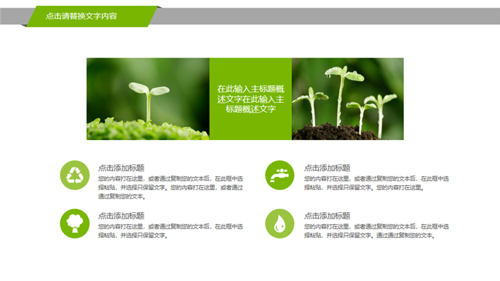 PPT简介: 绿色清新植物生长春天主题环保通用PPT模板以绿色新生嫩芽为封面模板,主章节以封面元素保持一致,整体模板以绿色为基础色调,内容以目录为依据,结合各种数据图形图表进行阐述,内容文本和插图可自由编辑修改,风格清养眼,通用于春天主题、环保主题等方面演示模板。本作品提供pptx格式文件下载,站长素材PPT大全提供精选的PPT模板素材。
