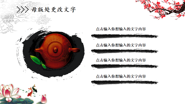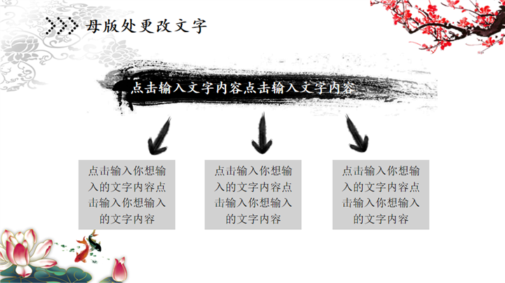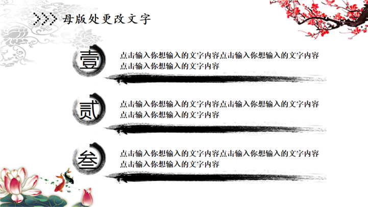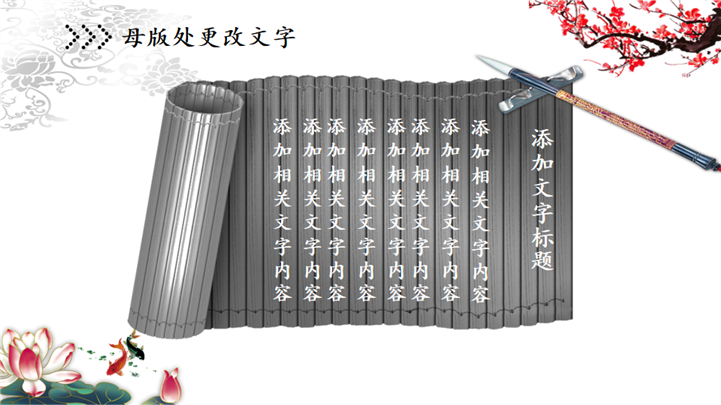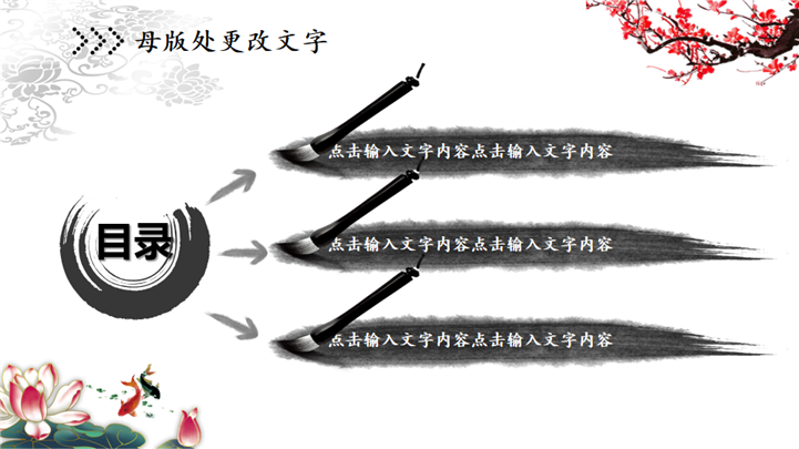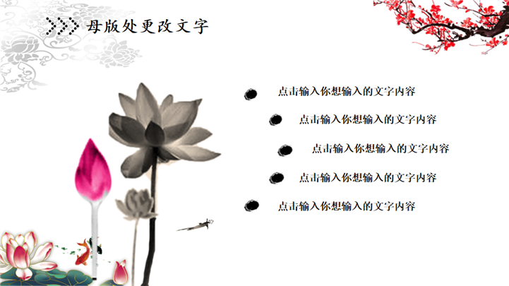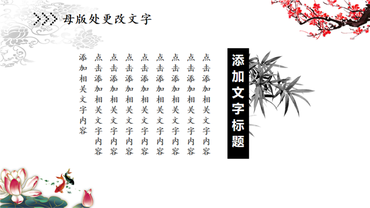 PPT简介: 精美中国水墨风工作总结会议报告PPT模板是一款中国风PPT模板,以梅花、锦鲤、荷塘、荷花等中国风元素为封面,内容元素与封面保持一致,并结合各种不同水墨风格笔刷进行排版展示,透着浓浓的古典气息,通用于工作汇报、总结、会议、晚会等方面演示模板。本作品提供pptx格式文件下载,站长素材PPT大全提供精选的PPT模板素材。