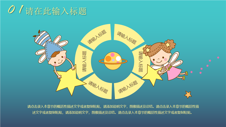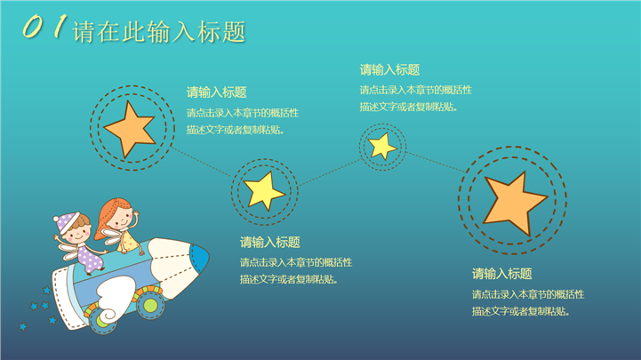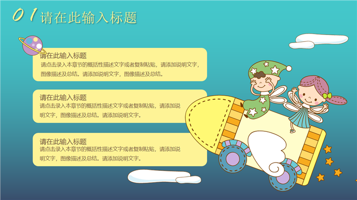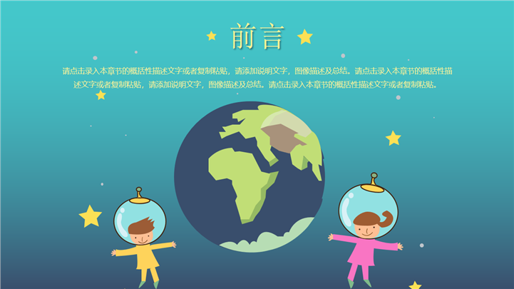 PPT简介: 可爱卡通幼儿教育专用PPT模板是一款卡通风格PPT模板,以火箭、地球、星星、飞船、数字、儿童等卡通元素为封面背景,内容以目录为依据,结合各种图文排版方式进行呈现,内容文本和卡通插图均可自由修改替换,整套模板以卡通元素进行多方位覆盖,尽显可爱风格,适用于卡通场景的幼儿教育课件演示模板。本作品提供pptx格式文件下载,站长素材PPT大全提供精选的PPT模板素材。