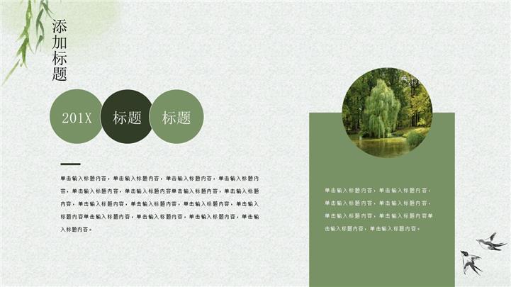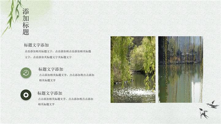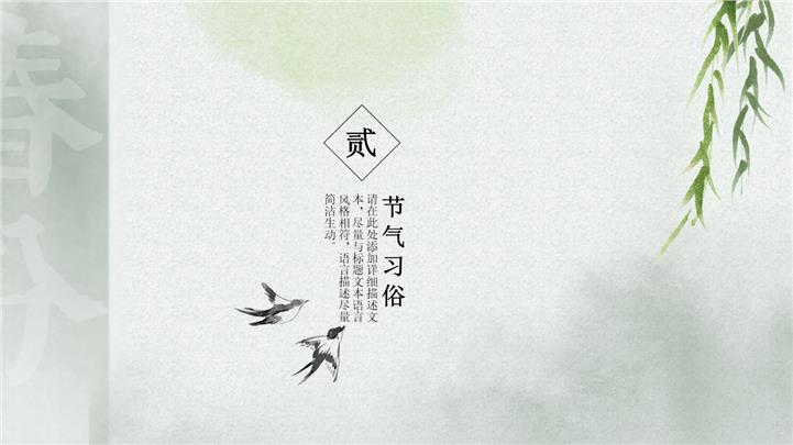 PPT简介: 简约中国传统节气春分ppt模板,古典水墨中国风,清新柳枝、燕子为设计元素,整体界面简约中式风格设计,淡雅浅绿色为主,包含节气的由来、节气习俗、节气养生、节气诗词、内容页感谢等主要模块,图文排版页面为主,框架结构完整,动态播放效果。适用于春分、春分节气、传统节气、24节气、二十四节气、春分传统节气等相关演示模板。主体文字及图片可替换修改,文字修改均可直接点击文本框进行编辑,图片更改可选中图片后单击鼠标右键插入更换图片,也可根据自身需求增加和删除。本作品提供pptx格式文件下载,站长素材PPT大全提供精选的PPT模板素材。
