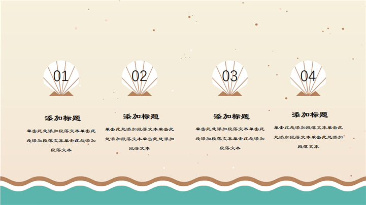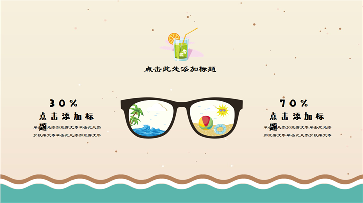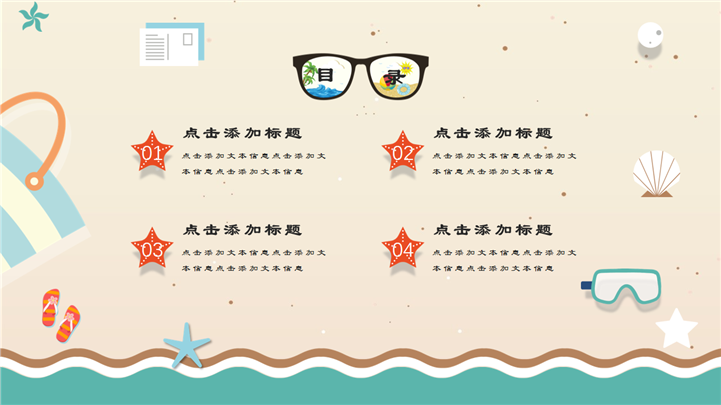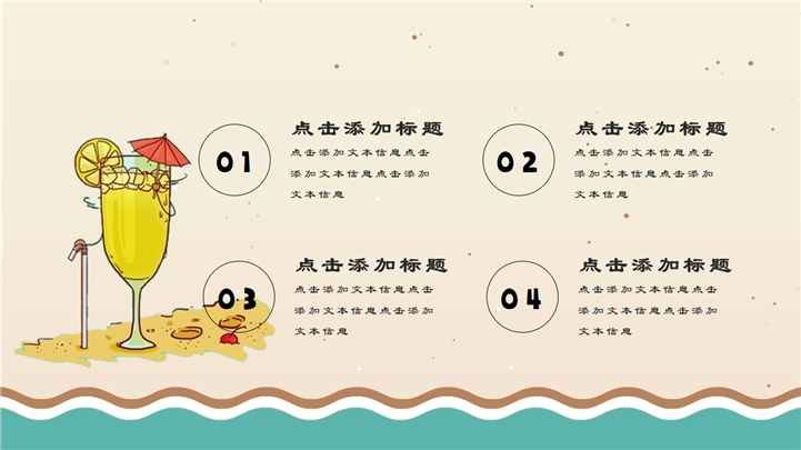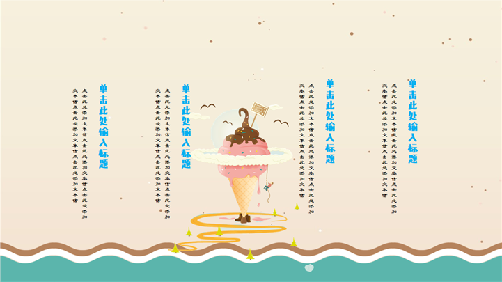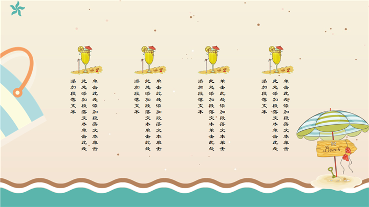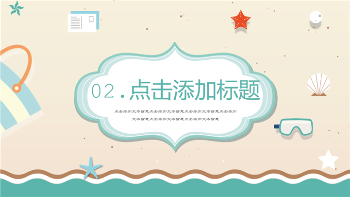 PPT简介: 简约小清新夏日卡通PPT模板是一款夏日主题PPT模板,以沙滩、海星、海浪、贝壳等元素为模板背景,并将其背景贯穿整套模板,内容包含夏日饮品、遮阳伞、糕点、冰激凌等卡通手绘元素,通过不同的图文排版方式进行呈现,整体风格简约又显小清新,通用于各种不同夏日主题演示模板。本作品提供pptx格式文件下载,站长素材PPT大全提供精选的PPT模板素材。