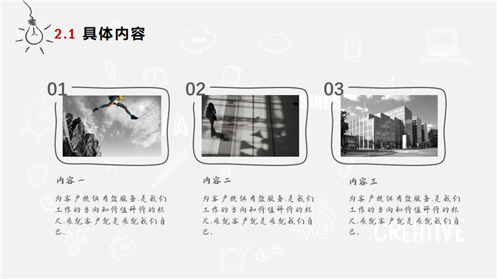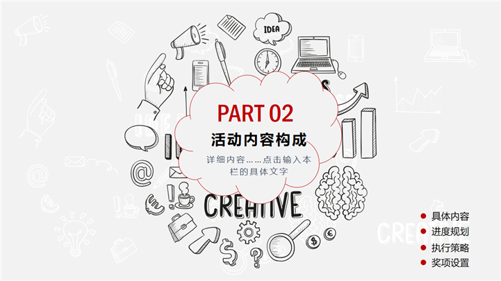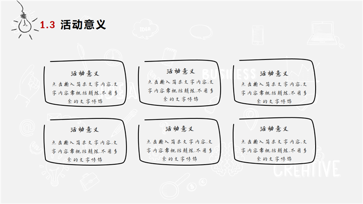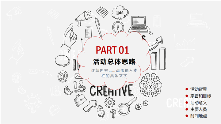 PPT简介: 简约商务手绘风格活动策划方案PPT模板是一款活动策划方案PPT模板,以商务手绘小元素为封面,主章节内容页与封面保持一致,内容涵盖活动总体思路、活动内容构成、活动运作方式、活动经费预算和活动效果逾期等方面,整体风格简约商务,通用于各种不同方案的活动策划演示模板。本作品提供pptx格式文件下载,站长素材PPT大全提供精选的PPT模板素材。