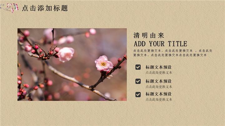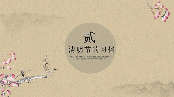 PPT简介: 古风典雅大气传统节日清明节ppt模板,古香古色设计,水墨元素为装饰,整体界面古典大气中国风,包含清明节的由来、清明节的习俗、清明节的食物、清明节的文字、感谢等主要模块,图文排版页面为主,框架结构完整,动态播放效果。适用于清明、清明节、清明主题、烟雨清明、清明祭祖、清明节宣传、清明节传统节日等相关演示模板。主体文字及图片可替换修改,文字修改均可直接点击文本框进行编辑,图片更改可选中图片后单击鼠标右键插入更换图片,也可根据自身需求增加和删除。本作品提供pptx格式文件下载,站长素材PPT大全提供精选的PPT模板素材。
