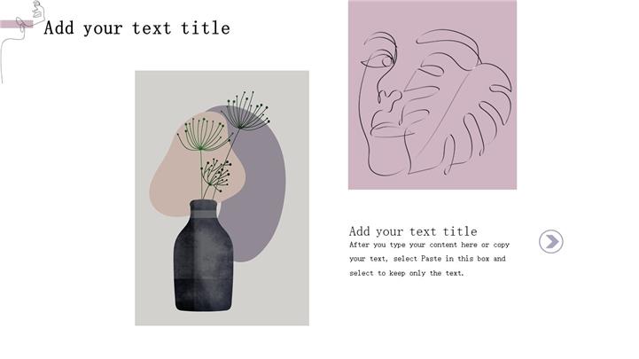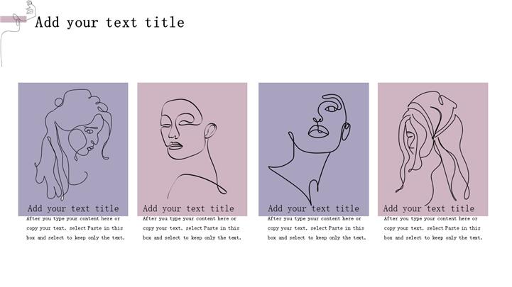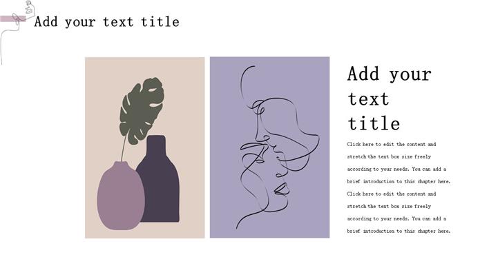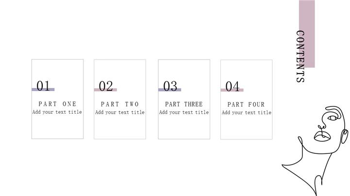 PPT简介: 极简主义线条设计杂志画册宣传ppt模板,淡雅粉紫色为主色调,抽象动感线条设计、很有艺术范,既简约又有设计感,整体界面森系淡雅文艺清新风格,包含目录、小结标题、内容页、感谢页等主要模块,图文排版页面为主,框架结构完整,动态播放效果。适用于企业宣传、企业画册、化妆品宣传、女神节活动营销、女性时尚画册、美妆营销、职业礼仪、社交礼仪等相关演示模板。主体文字及图片可替换修改,文字修改均可直接点击文本框进行编辑,图片更改可选中图片后单击鼠标右键插入更换图片,也可根据自身需求增加和删除。本作品提供pptx格式文件下载,站长素材PPT大全提供精选的PPT模板素材。