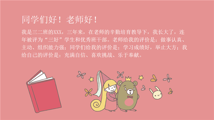 PPT简介: 粉色风格小学生班干部竞选自我介绍PPT模板以粉色为模板背景基础色调,并贯穿整套模板,包含书籍、火箭、儿童、小熊、地球仪、画笔、书桌等卡通元素,内容涵盖个人基础信息、自荐信、我的爱好、我的性格、我的生活、我的理想、我的荣誉、获奖证书、竞选目标等方面,整体配色柔和,风格简约,适用于小学各年级各班干部岗位竞选自我介绍方面演示模板。本作品提供pptx格式文件下载,站长素材PPT大全提供精选的PPT模板素材。