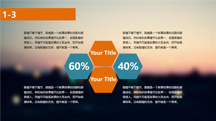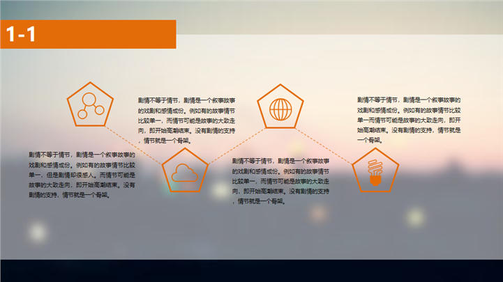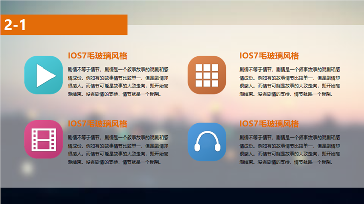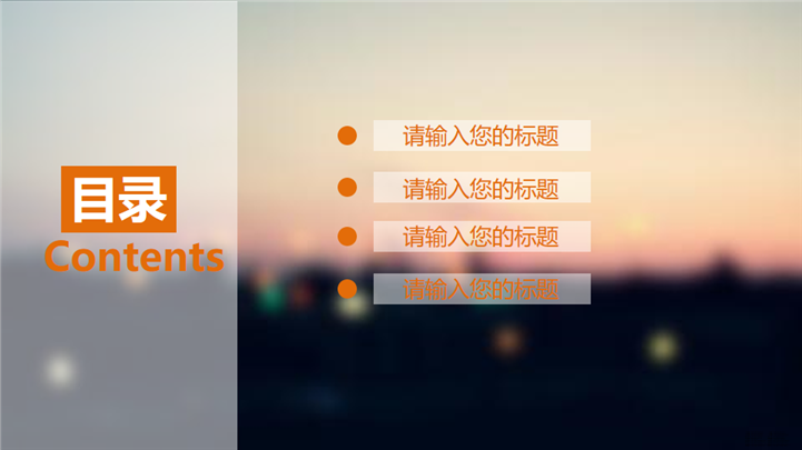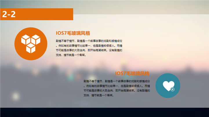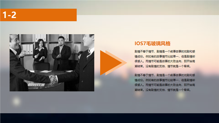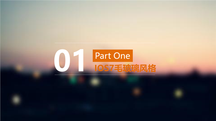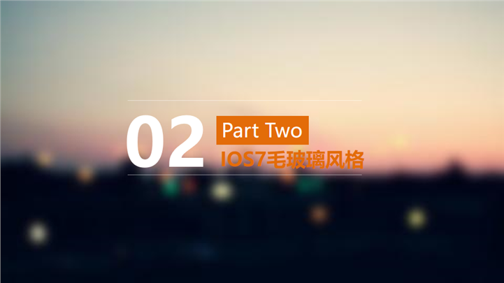 PPT简介: 扁平化IOS毛玻璃风格工作总结商业推广PPT模板以IOS毛玻璃风格的黄昏城市建筑剪影为模板背景,并将其背景贯穿整套模板,内容以目录为依据,结合各种数据图表进行阐述,内容文本和插图可自由编辑修改,适用于工作汇报、工作总结、商业推广等方面演示模板。本作品提供pptx格式文件下载,站长素材PPT大全提供精选的PPT模板素材。