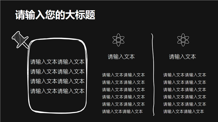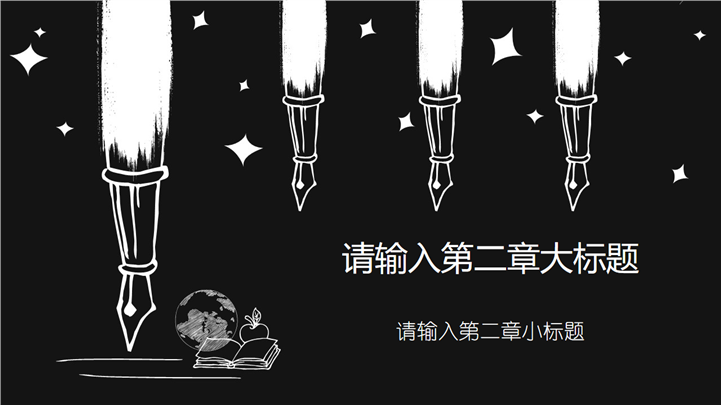PPT简介: 黑色背景手绘教育教学钢笔文艺PPT模板以黑色背景为模板底纹背景,并贯穿整套模板,以钢笔、书籍、地球仪、星星等手绘风格元素为封面,主章幻灯片与封面元素保持一致,内容以目录为依据,包含眼镜、五角星、灯泡等不同粉笔手绘风格元素,略显文艺风格,适用于教育行业演示模板。本作品提供pptx格式文件下载,站长素材PPT大全提供精选的PPT模板素材。
