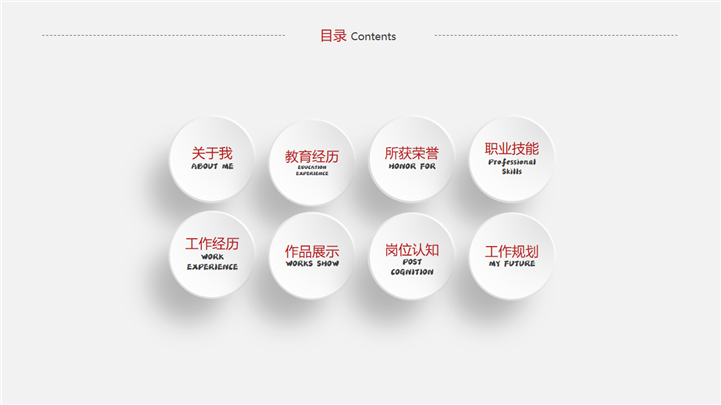 PPT简介: 极简微粒体风格个人简历展示PPT模板是一款个人简历PPT模板,以白色为基础元素配色,以红色和黑色为文字配色,以微粒体为元素贯穿整套模板,内容涵盖关于我、教育经历、所获荣誉、职业技能、工作经历、作品展示、岗位认知、工作规划等方面,框架完整,内容详实,适用于各行业岗位个人简历展示方面演示模板。本作品提供pptx格式文件下载,站长素材PPT大全提供精选的PPT模板素材。