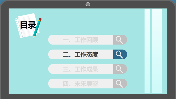 PPT简介: 蓝色扁平化风格个人述职报告PPT模板是一款个人述职报告PPT模板,以蓝色为模板基础色调,内容元素以扁平化风格进行呈现,内容涵盖工作回顾、工作态度、工作成果和未来展望等方面,并结合各种不同的数据图形、图表和图标进行阐述分析,框架完整,内容文本和插图可自由编辑修改替换,适用于各行业岗位个人述职报告等方面演示模板。本作品提供pptx格式文件下载,站长素材PPT大全提供精选的PPT模板素材。