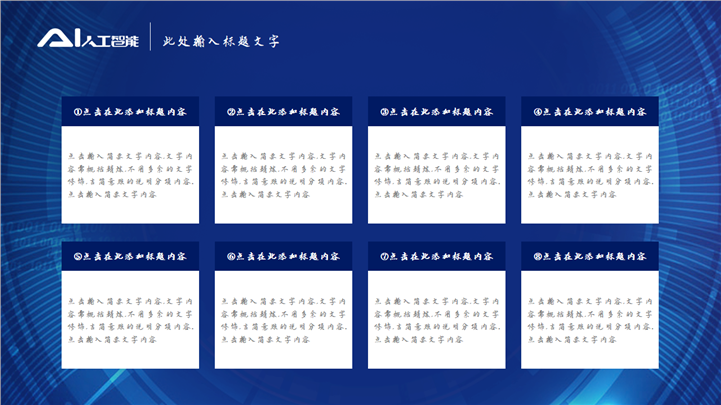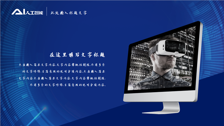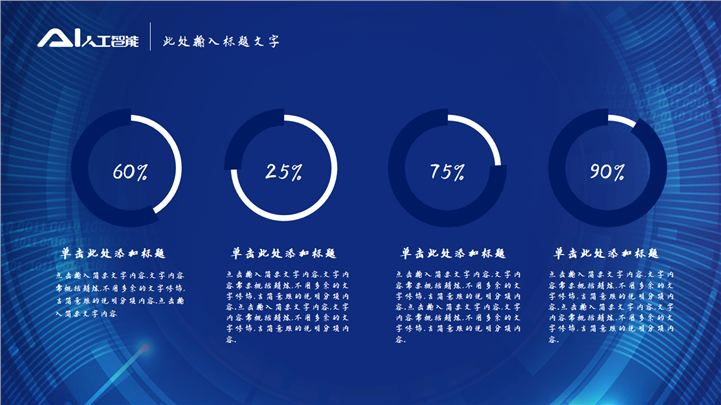 PPT简介: 蓝色智慧城市物联生活AI人工智能PPT模板以蓝色科技背景为模板底纹背景,并贯穿整套模板,以AI人工智能为封面标题,内容以目录为依据,结合各种数据图形图表和科技场景插图进行阐述分析,内容文本和插图可自由编辑修改替换,整套模板极具科技感,适用于AI人工智能、智慧城市、全息通讯、万物互联、智能家居、远程医疗、物联生活等方面演示模板。本作品提供pptx格式文件下载,站长素材PPT大全提供精选的PPT模板素材。