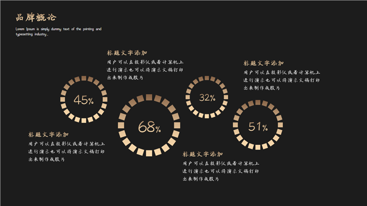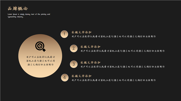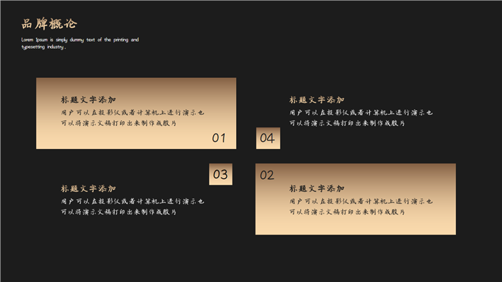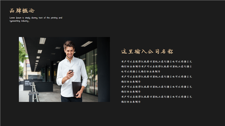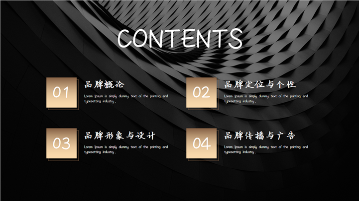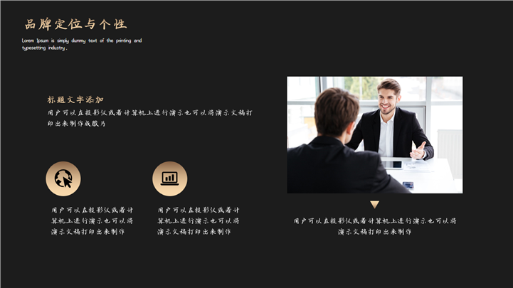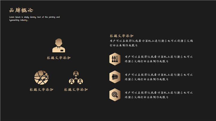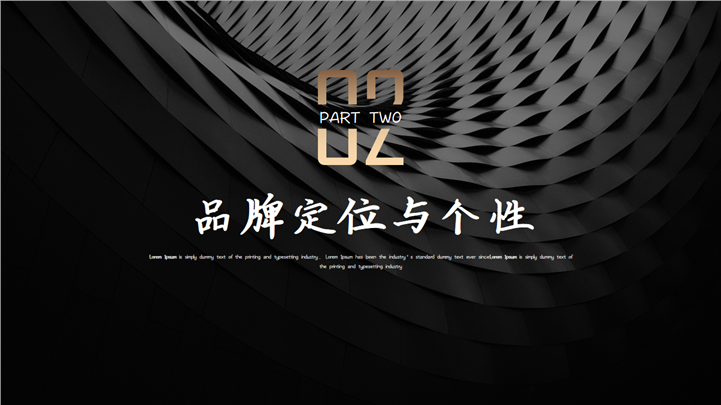 PPT简介: 时尚土豪金欧美风品牌营销PPT模板是一款品牌营销PPT模板,以黑色为模板基础背景色调,以土豪金和白色为文案和插图色块基础色调,内容涵盖品牌改了、品牌定位与个性、品牌形象与设计、品牌传播与广告等方面,整体风格时尚有质感,适用于各行业产品品牌营销等方面演示模板。本作品提供pptx格式文件下载,站长素材PPT大全提供精选的PPT模板素材。