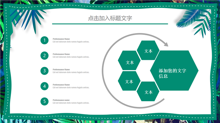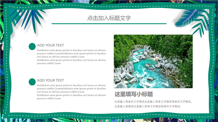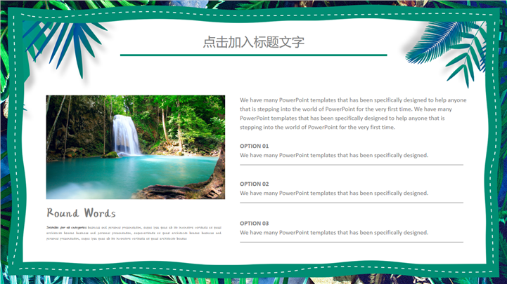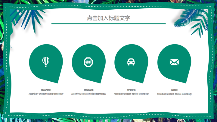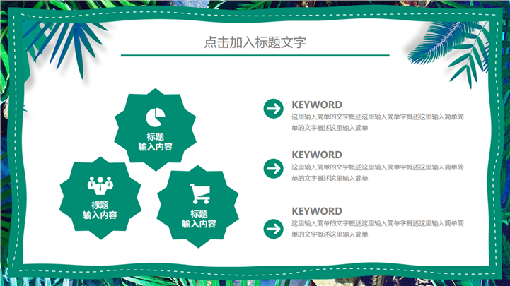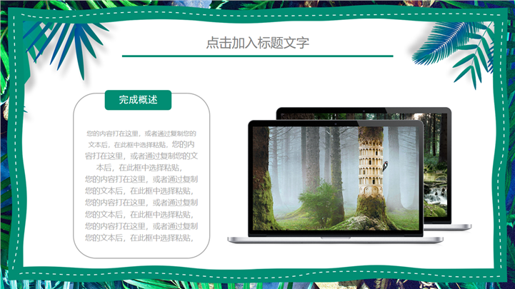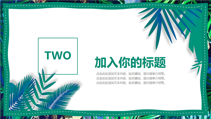 PPT简介: 热带树叶风格绿色环保教育主题PPT模板以热带树叶边框为模板底纹背景,内容文本和插图元素配色与封面保持一致,内容以目录为依据,结合各种数据图表进行阐述分析,框架完整,内容详实,文本和插图可自由编辑修改替换,适用于各种不同主题的环保教育等方面演示模板。本作品提供pptx格式文件下载,站长素材PPT大全提供精选的PPT模板素材。