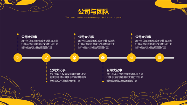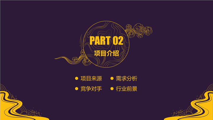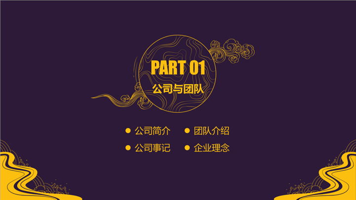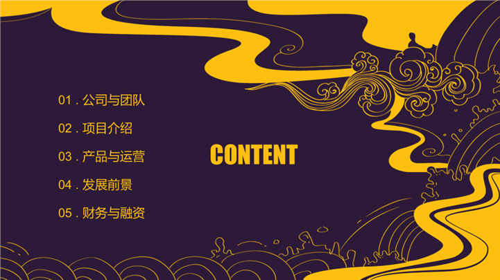 PPT简介: 古典祥云风格企业融资计划书PPT模板是一款融资计划书PPT模板,以古典祥云元素为封面,并将其元素贯穿整体模板,以紫色为基础背景色调,以黄色为元素色调,内容涵盖公司与团队、项目介绍、产品于运营、发展前景、财务于融资等方面,框架完整,内容详实,风格极具古典气息,通用于各行业公司企业融资计划书等方面演示模板。本作品提供pptx格式文件下载,站长素材PPT大全提供精选的PPT模板素材。
