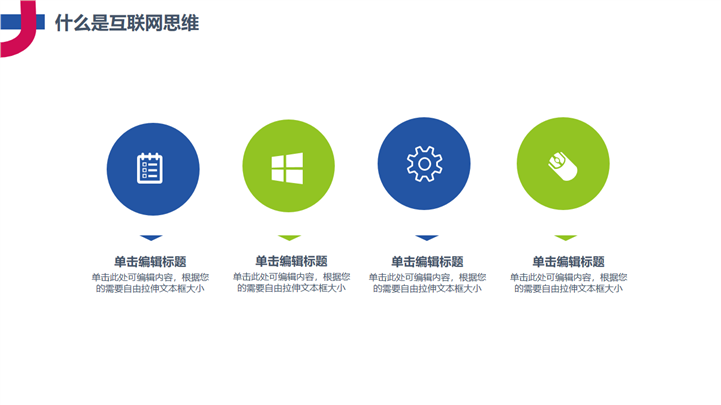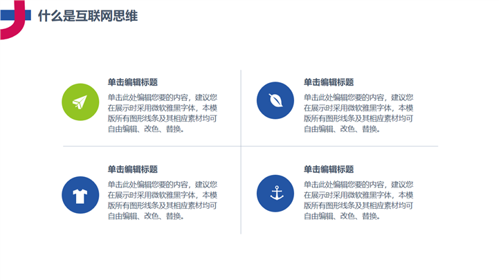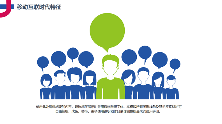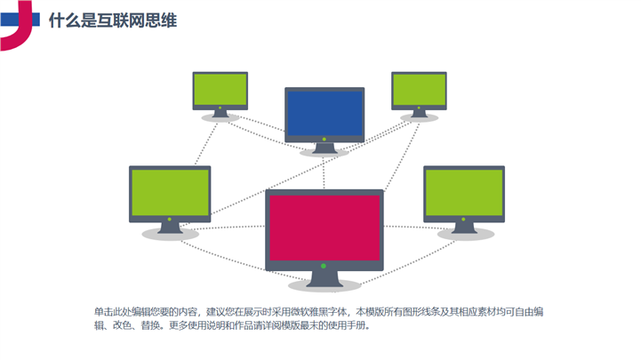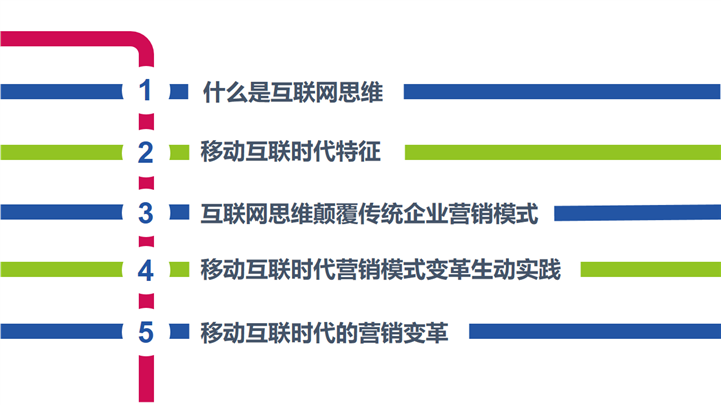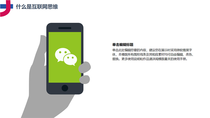 PPT简介: 极简风格互联网思维主题课件分享PPT模板是一款以互联网思维为主题的PPT模板,以线条、色块和图标为封面,内容涵盖什么是互联网思维、移动互联时代特征、互联网思维颠倒传统企业营销模式、移动互联时代营销模式变革生动时间、移动互联时代的营销变革等方面,框架完整,内容文本可自由编辑修改,适用于各种互联网主题课件分享等方面演示模板。本作品提供pptx格式文件下载,站长素材PPT大全提供精选的PPT模板素材。
