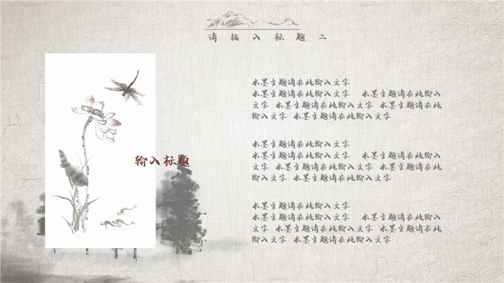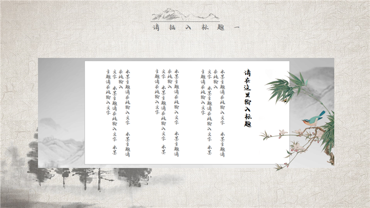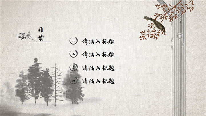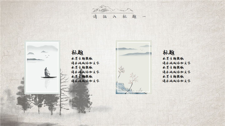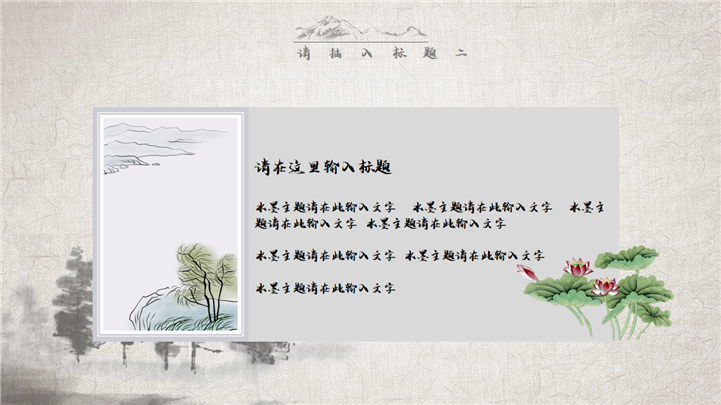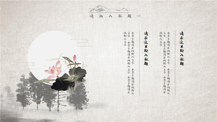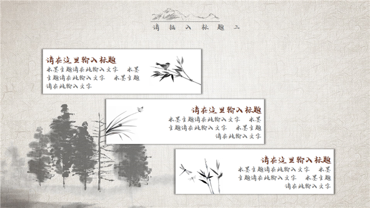 PPT简介: 经典复古水墨中国风通用PPT模板是一款中国风PPT模板,封面包含树木、船舶、湖泊、白鹤、梅花、红日等水墨风格元素,内容树木、花草、荷塘、竹子、杨柳、山丘等水墨元素,内容以目录为依据,标题、文本、插图元素均可自由编辑修改替换,整体风格极具古典气息,适用于中国古典场景等方面演示模板。本作品提供pptx格式文件下载,站长素材PPT大全提供精选的PPT模板素材。